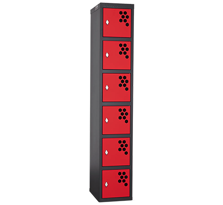 Each of the six compartments includes a double 240v socket for dual charging.  The perforated doors ensure proper ventilation and visibility while your batteries charge securely within the reinforced steel structure.